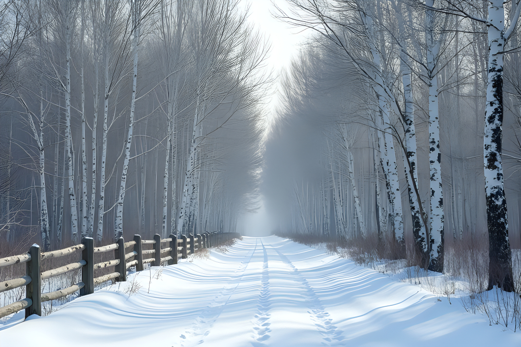 눈 덮인 산책로와 자작나무 숲의 고요한 풍경