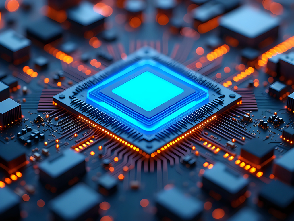회로판 위에 푸른 마이크로칩 클로즈업.
