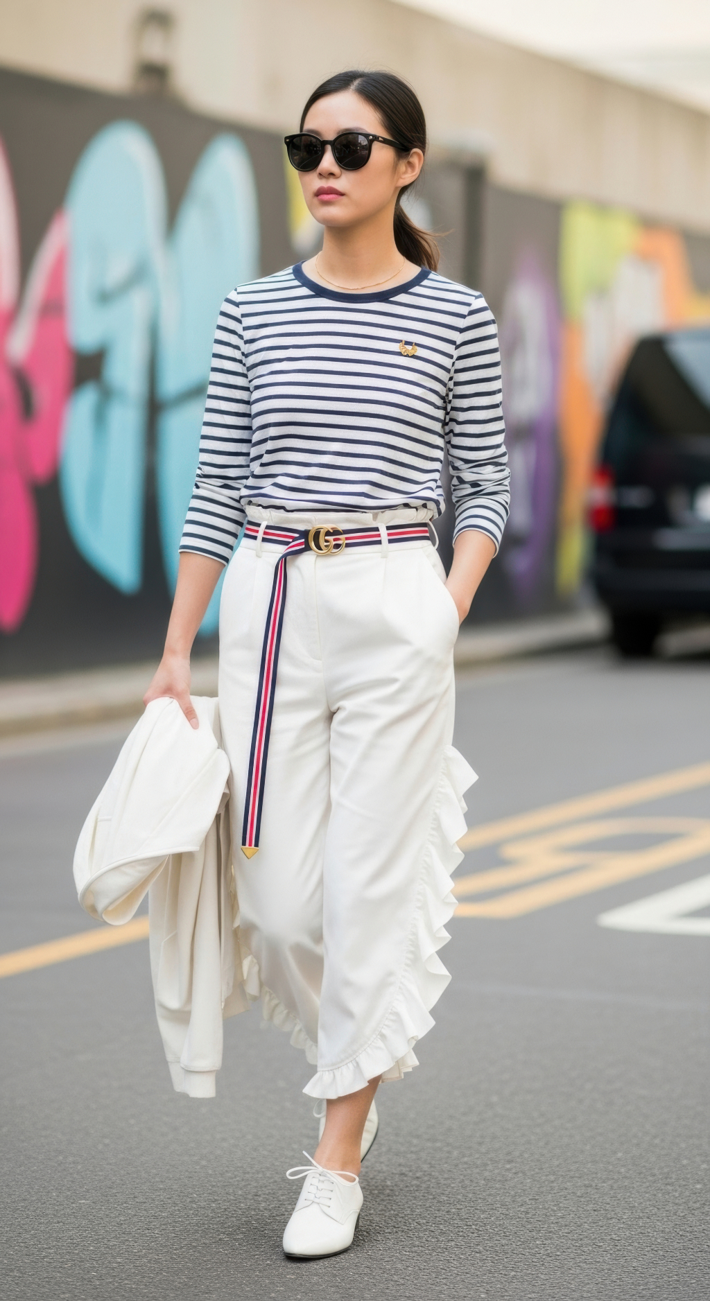 줄무늬 셔츠와 흰 바지 입은 여자