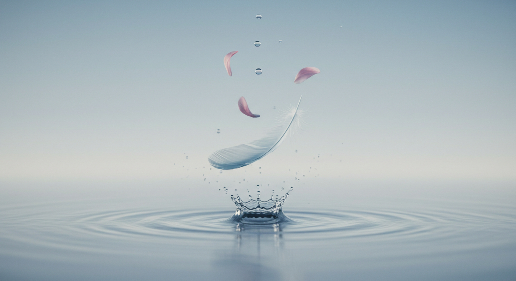 깃털과 꽃잎이 물에 떨어지는 모습,