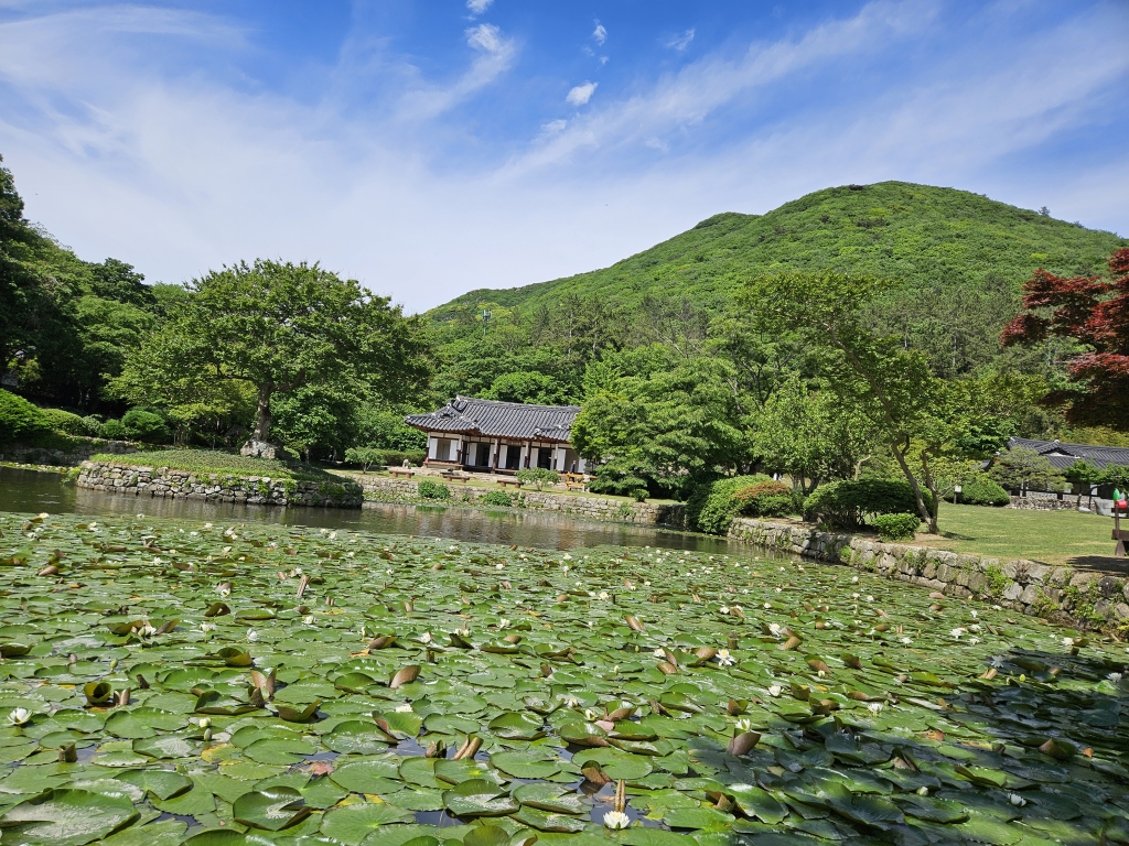 연못과 정자, 푸른 산이 있는 아름다운 풍경