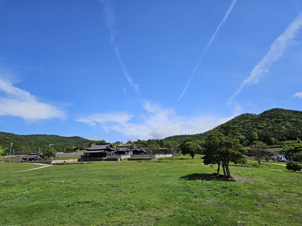 푸른 하늘 아래 녹색 들판과 전통 건물, 산 풍경,