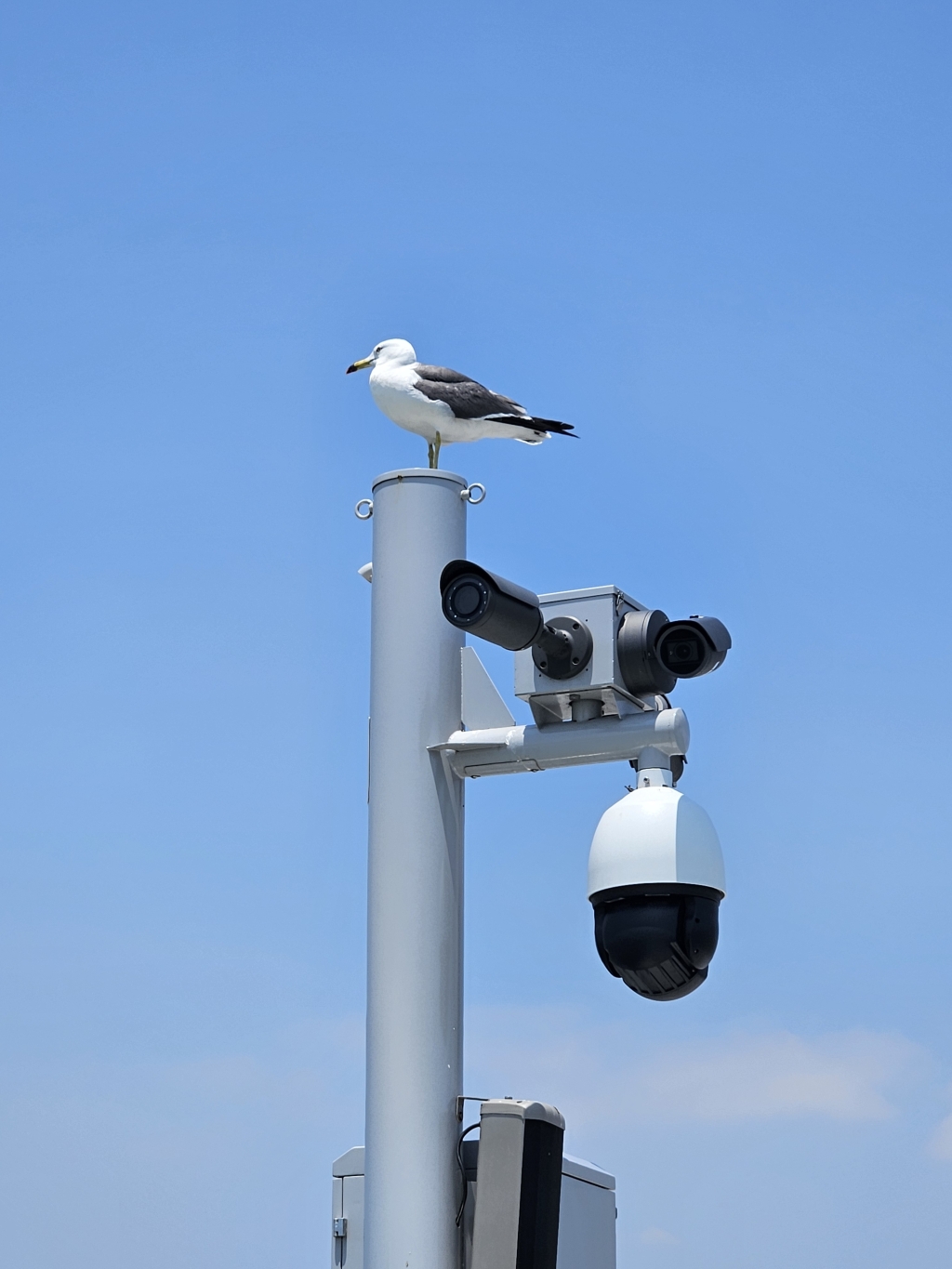갈매기가 감시 카메라가 설치된 기둥에 앉아 있다.
